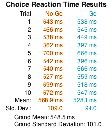 Beyond the penalty for the choice, we also notice that Shaibu had a faster reaction time using his preferred (left) hand than his non-preferred hand in both the simple and choice reaction time conditions. In the simple reaction time condition the penalty was about 50 milliseconds, while it was only about 40 milliseconds in the choice reaction time condition.